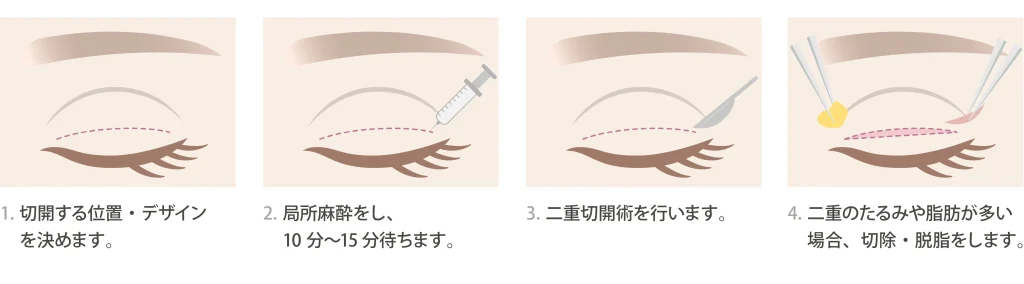 A 小切開はまぶたを1~2cm程度切開しますが、全切開の場合まぶたを3~4cm程度メスで切開します。