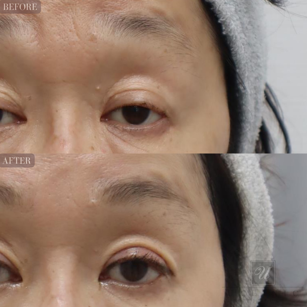 眼瞼下垂症手術により眼の開きを改善し、眉下切開により瞼のたるみを取除くことで更に眼の開きを改善しました。 また、眼のチカラだけで眼を開くようになったことで眉の上りが改善され、睫毛の向きも変わりました。