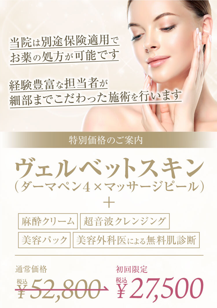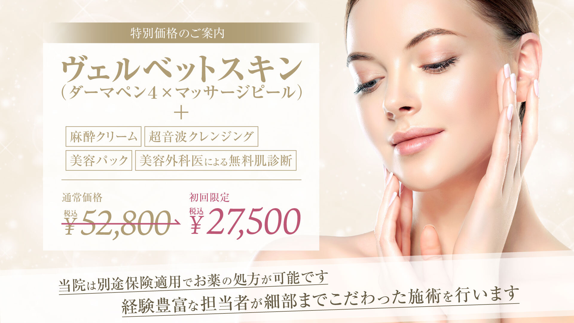 ヴェルヴェットスキン(ベルベットスキン)とは「ダーマペン4」と「マッサージピール」という2つの施術を組み合わせた美肌治療です。