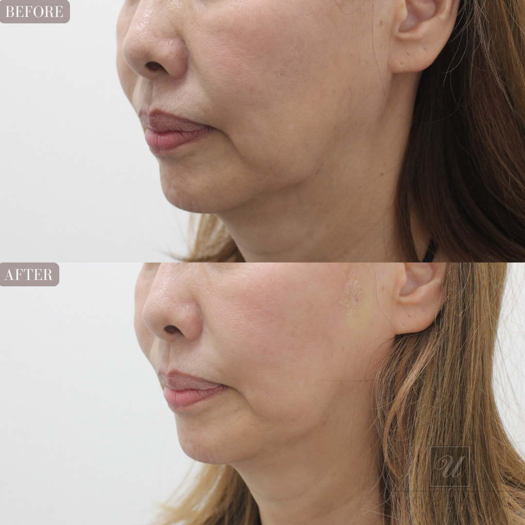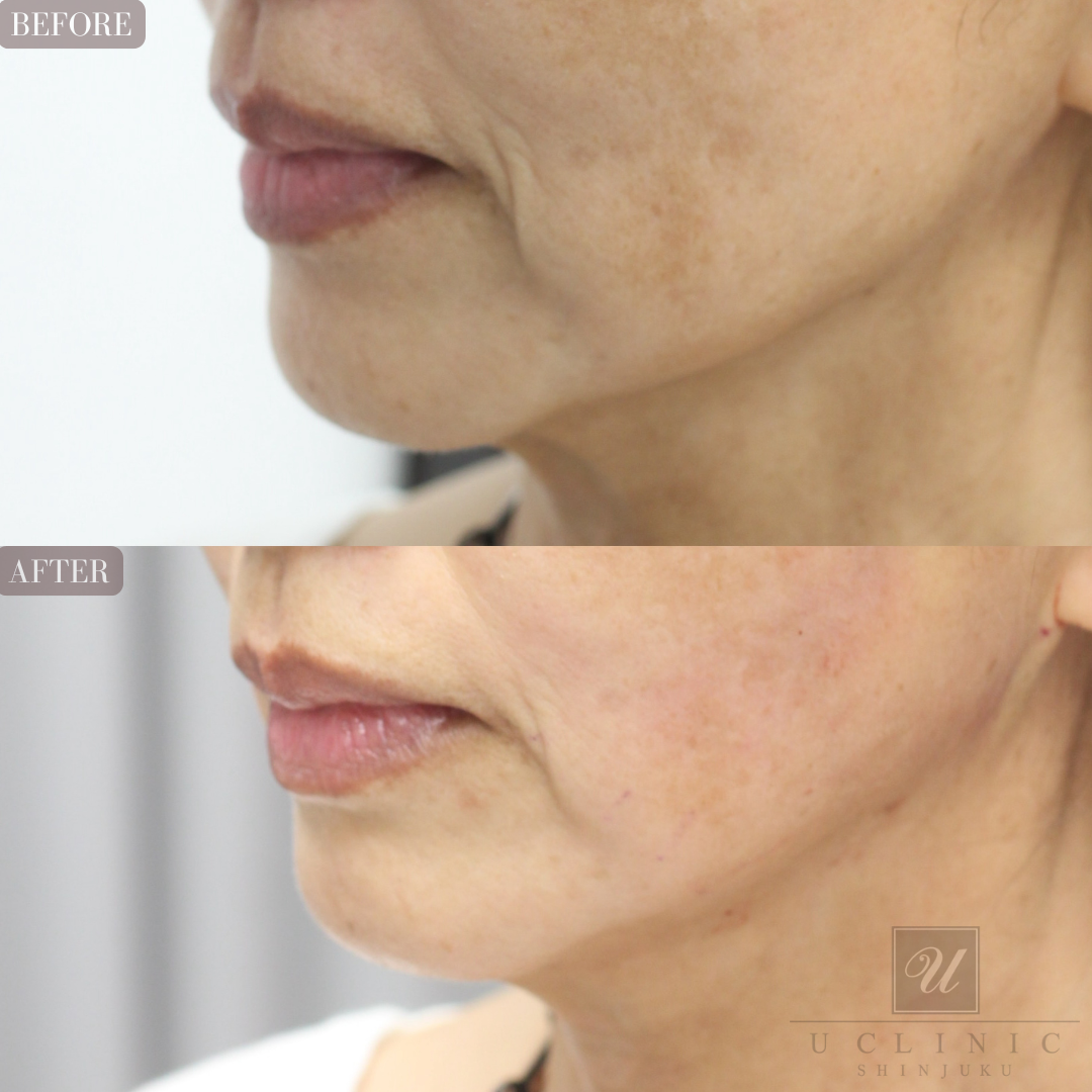スレッドリフトと同時に、顎へヒアルロン酸注入し輪郭・Eラインを整えることで、よりフェイスラインをすっきりさせました。